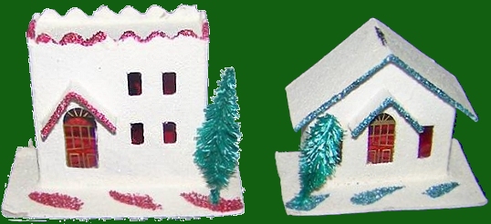 At first there was no sparkle to speak of - evidently it took the cardboard houses a few years to evolve into the sparkly buildings most of us remember today. And it wasn’t glitter, technically. Crushed mica was probably the most popular sparkly finish, and crushed shells were also used. Some putz houses had cotton batting “snow,” and others had a kind of coating that looked for all the world like shredded coconut. During his liftime, Ted Ted has catalogued an amazing variety of these things and attempted to narrow down which kinds were made in which years. So, when you visit our archive of his site, be certain to check his history pages.