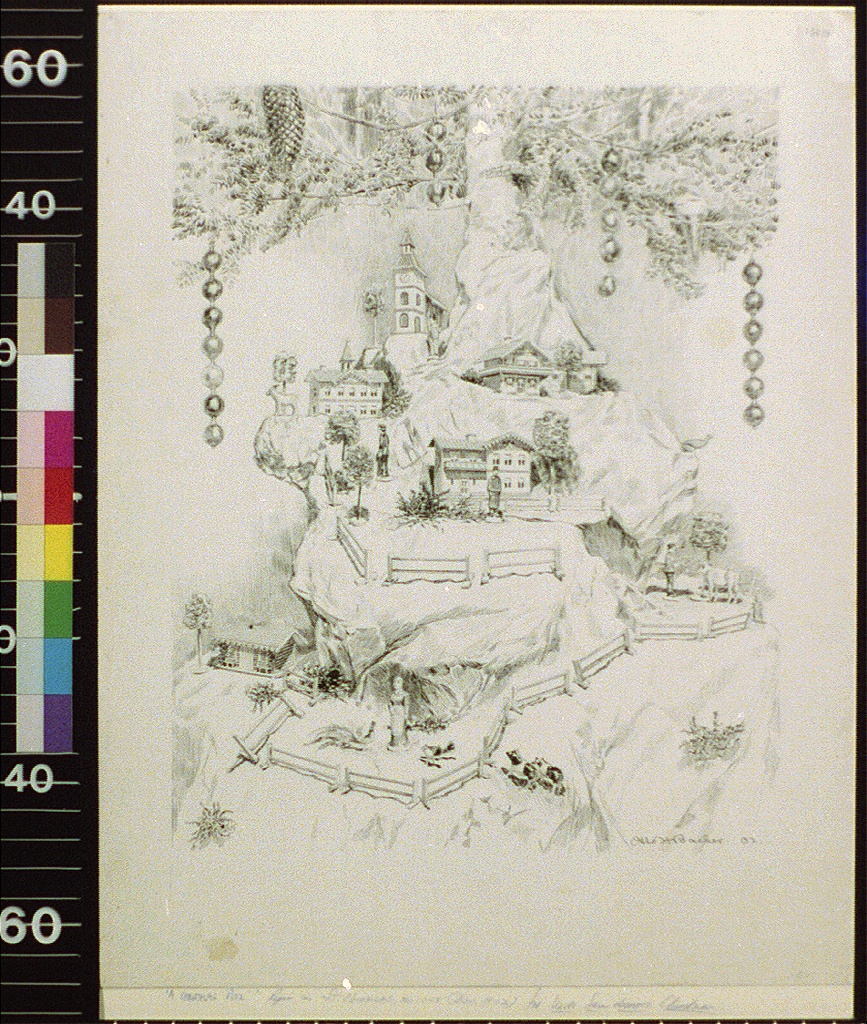 drawn from a real-life model. German style houses and animals pre- WW I.